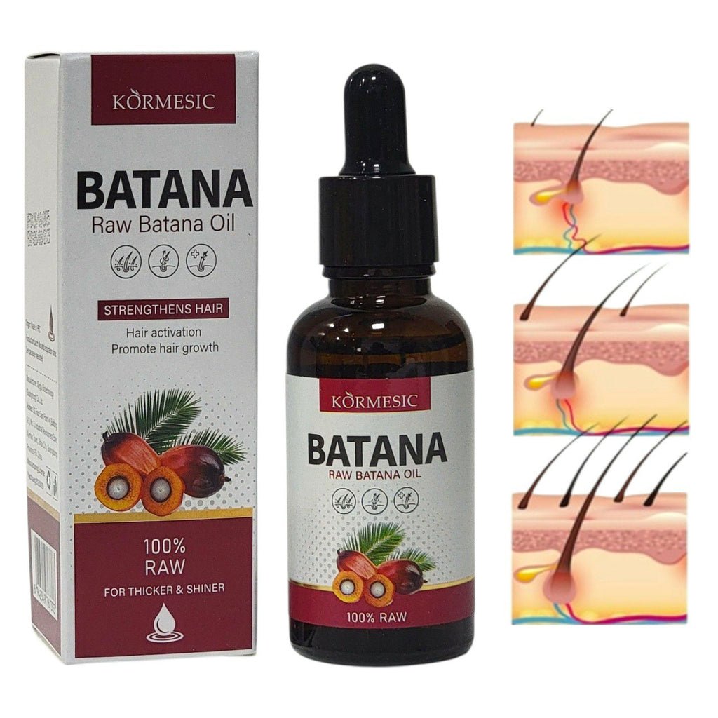KORMESIC BATANA RAW BATANA OIL ACEITE DE BATANA CRUDO, ACTIVA LOS FOLÍCULOS PILOSOS PARA PROMOVER UN CRECIMIENTO MÁS RÁPIDO Y CONSTANTE, AYUDA A QUE EL CABELLO CREZCA CON MAYOR VOLUMEN Y DENSIDAD, IDEAL PARA PERSONAS CON CABELLO FINO O RALO, REPARA LAS HEBRAS DAÑADAS Y PREVIENE EL QUIEBRE, FORTALECIENDO EL CABELLO DESDE LA RAÍZ HASTA LAS PUNTAS, APORTA UNA LUMINOSIDAD NATURAL Y SUAVIDAD SUPERIOR, RESTAURANDO LA HIDRATACIÓN PERDIDA POR PROCESOS QUÍMICOS O EL CALOR, CONT. 30ML
