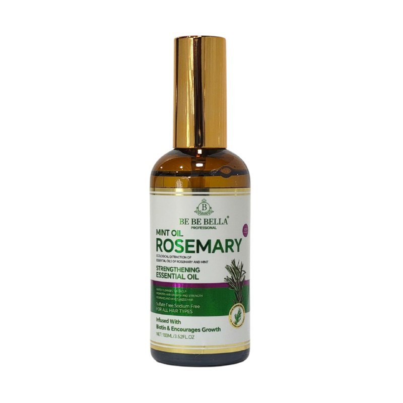BE BE BELLA PROFESSIONAL MINT OIL ROSEMARY ACEITE DE MENTA Y ROMERO EXTRACCIÓN ECOLÓGICA DE ACEITES ESENCIALES DE ROMERO Y MENTA, ACEITE ESENCIAL FORTALECEDOR, LIMPIA SUAVEMENTE EL CUERO CABELLUDO, PROMUEVE EL CRECIMIENTO Y LA FUERZA DEL CABELLO, NUTRE E HIDRATA EL CABELLO, LIBRE DE SULFATOS, LIBRE DE SODIO, PARA TODO TIPO DE CABELLO, INFUNDIDO CON BIOTINA Y FOMENTA EL CRECIMIENTO, CONT. 100ML