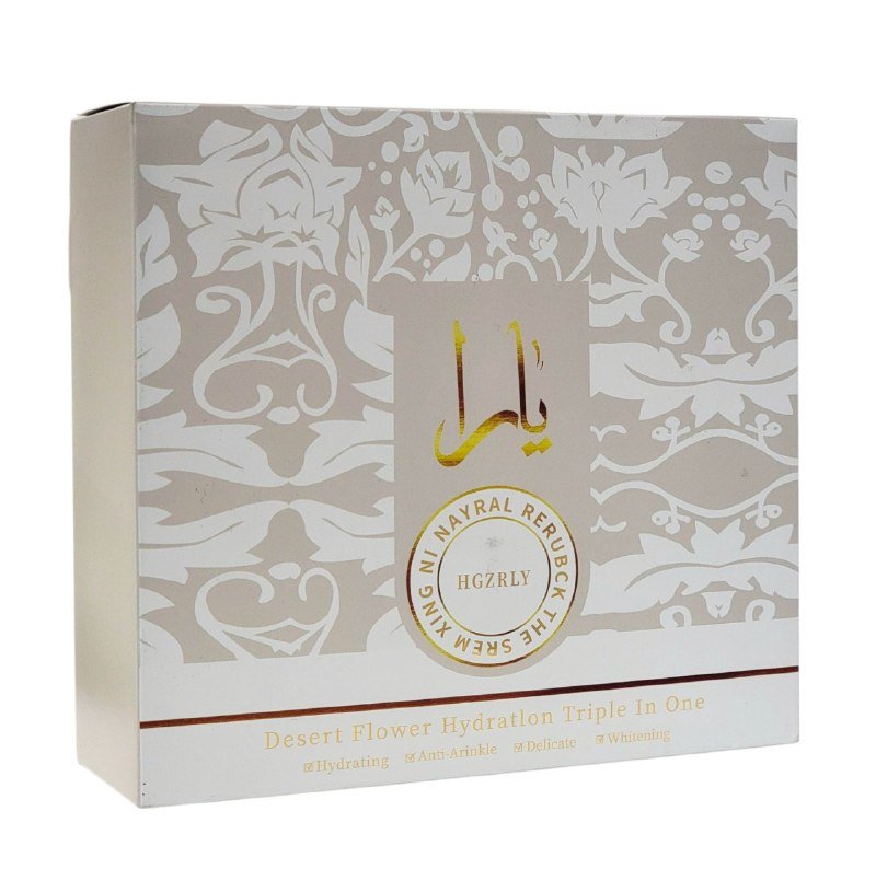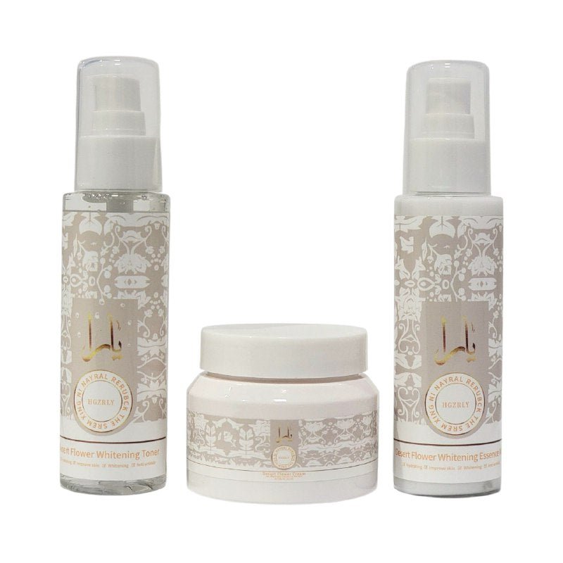 HGZRLY SET DE CUIDADO FACIAL HIDRATACIÓN TRIPLE EN UNO FLOR DEL DESIERTO HIDRATANTE Y BLANQUEADOR PARA PIELES DELICADAS INCLUYE -TÓNICO BLANQUEADOR DESERT FLOWER:RICO EN VITAMINAS Y ANTIOXIDANTES QUE MANTIENEN LA PIEL ÁSPERA Y SECA SUAVE, APORTANDO HIDRATACIÓN Y VITALIDAD CONT. 100ML-LECHE ESENCIAL BLANQUEADORA DESERT FLOWER: HIDRATA, REPONE LA HUMEDAD DE LA PIEL, MEJORA LA SEQUEDAD Y LA DEJA SUAVE Y TRANSLÚCIDA 100ML-CREMA DESERT FLOWER:ESTÁ ENRIQUECIDA CON INGREDIENTES BLANQUEADORES E HIDRATANTES QUE SE INFILTRAN RÁPIDAMENTE EN LAS CUTÍCULAS, ELIMINAN LA MELANINA, MEJORAN LA PIEL OPACA, CETRINA Y DESIGUAL Y POTENCIAN SU CAPACIDAD BLANQUEADORA, MANTENIÉNDOLA JUSTA, SUAVE, HIDRATADA Y ELÁSTICA CONT. 50G