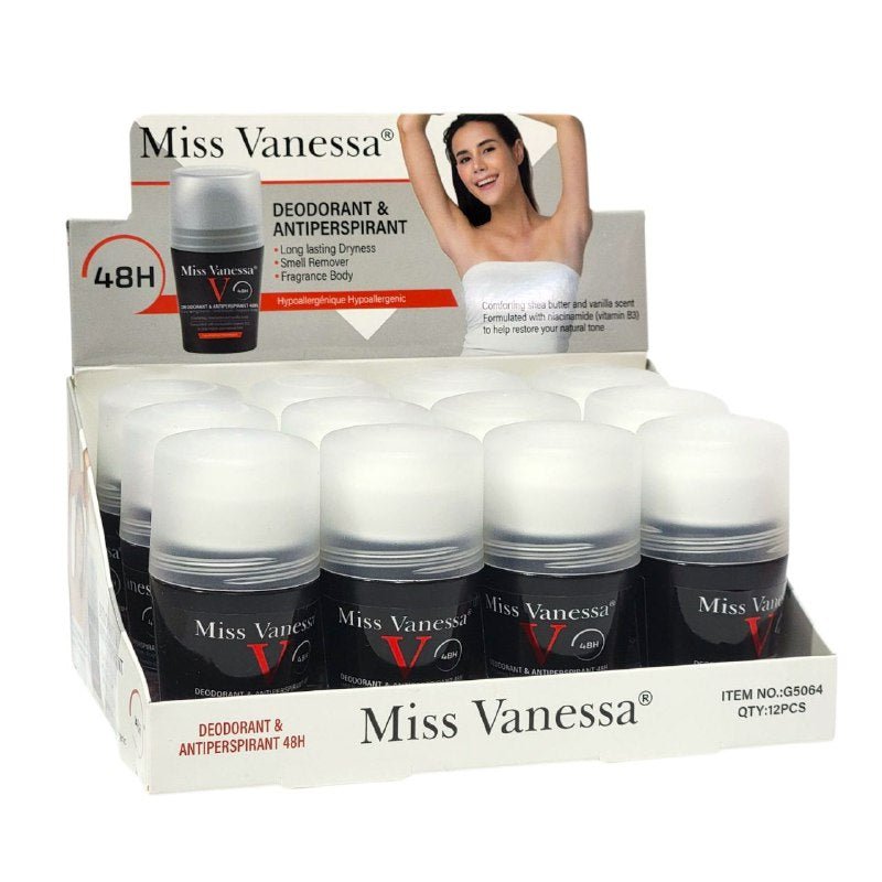 MISS VANESSA, DESODORANTE Y ANTITRANSPIRANTE CON DURACION DE 48HRS, PERMITE SEQUEDAD DE LARGA DURACION, ELIMINA LOS OLORES, CUERPO DE FRAGANCIA, HIPOALERGENICO, RECONFORTANTE AROMA A MANTECA DE KARITÉ Y VAINILLA FORMULADO CON NIACINAMINA (VITAMINA B3) PARA AYUDAR A RESTAURAR SU TONO NATURAL, CONT. 50ML
