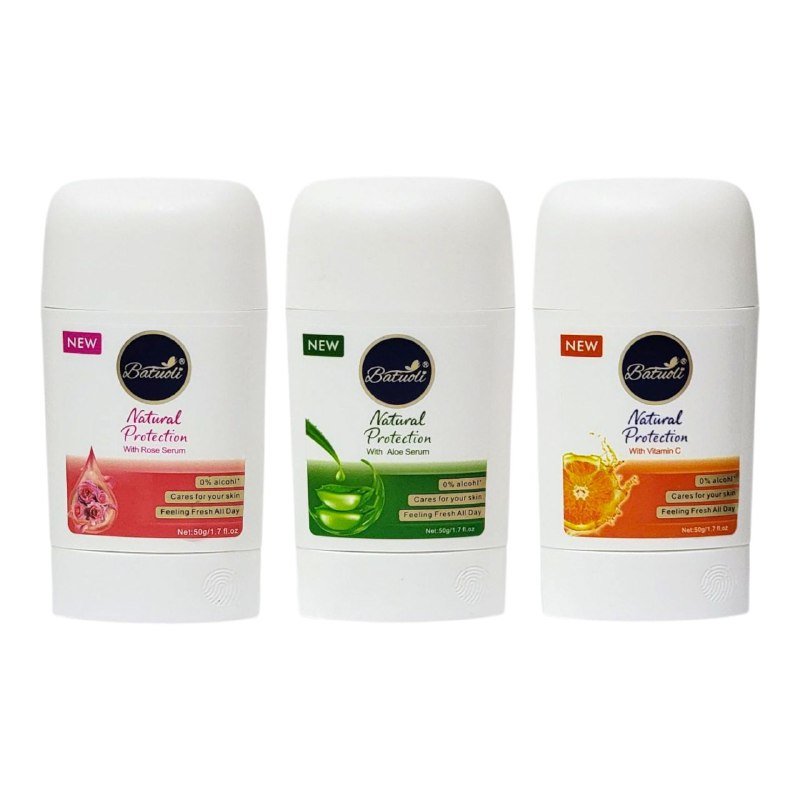 BATUOLI DESODORANTE ANTITRANSPIRANTE EN BARRA EL DESODORANTE EN BARRA BATUOLI OFRECE 24 HORAS DE PROTECCIÓN Y UNA APLICACIÓN SUAVE EXPERIMENTE UNA SENSACIÓN EXTRA FRESCA Y NO PEGAJOSA EN LA PIEL CON SU FÓRMULA ÚNICA EFECTO FRESCO DE LARGA DURACIÓN QUE DURA MÁS DE UNAS POCAS HORAS CIENTÍFICAMENTE PROBADO PARA COMBATIR ACTIVAMENTE LAS BACTERIAS QUE CAUSAN EL MAL OLOR Y OFRECE UNA SELECCIÓN DE FRAGANCIAS INCREÍBLES EXPERIMENTE UNA SENSACIÓN EXTRA FRESCA Y NO PEGAJOSA EN LA PIEL LA FÓRMULA DERMATOLÓGICAMENTE PROBADA Y SIN ALCOHOL ETÍLICO ES SUAVE PARA LA PIEL CONTIENE 0 % DE ALUMINIO CONT. 50G