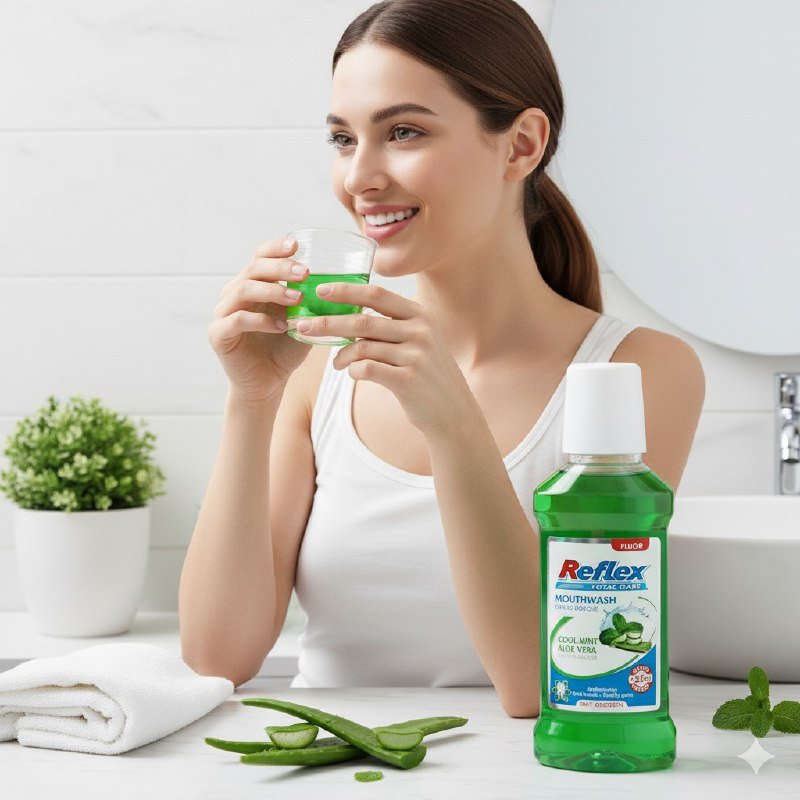 REFLEX MOUTHWASH, ENJUAGUE BUCAL CON AROMA A MENTA FRESCA Y ALOE VERA, ANTIBACTERIANO, ALIENTO FRESCO, ENCÍAS SANAS, PARA USO DIARIO, CONT. 225ML