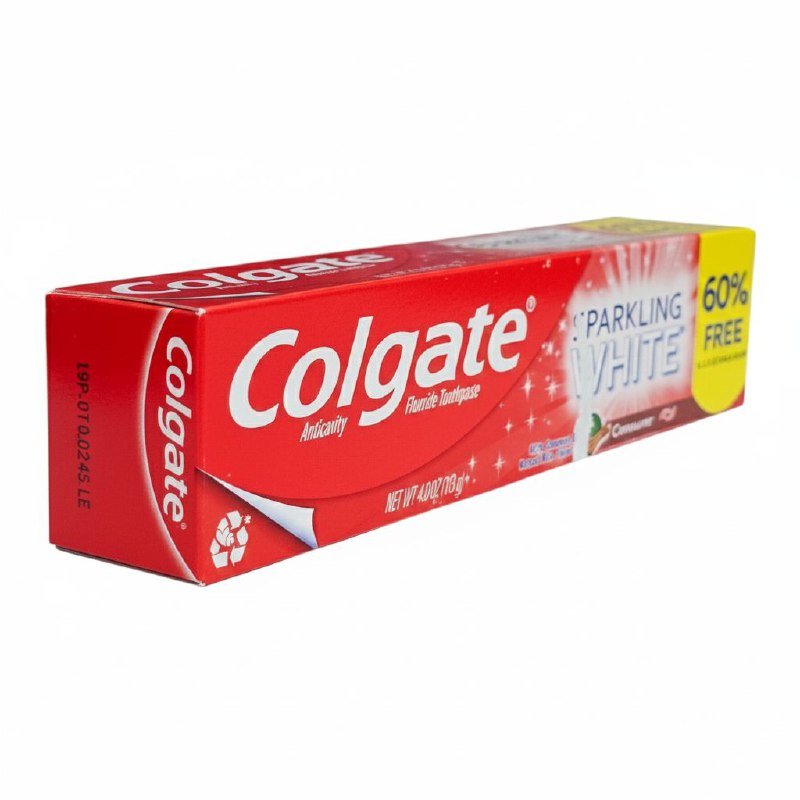 COLGATE, SPARKLING WHITE, BLANCO BRILLANTE, ANTICAVITY AND FLUORIDE TOOTHPASTE, PASTA DENTAL ANTICARIES Y CON FLÚOR, CINNAMON AND NATURAL MINT FLAVORS, SABOR A CANELA Y MENTA NATURAL, FÓRMULA DE PROTECCIÓN CONTRA MANCHAS QUE AYUDA A ELIMINAR Y PREVENIR SU ACUMULACIÓN. BLANQUEA LOS DIENTES Y COMBATE LAS CARIES CON FLÚOR, CONT. 113G