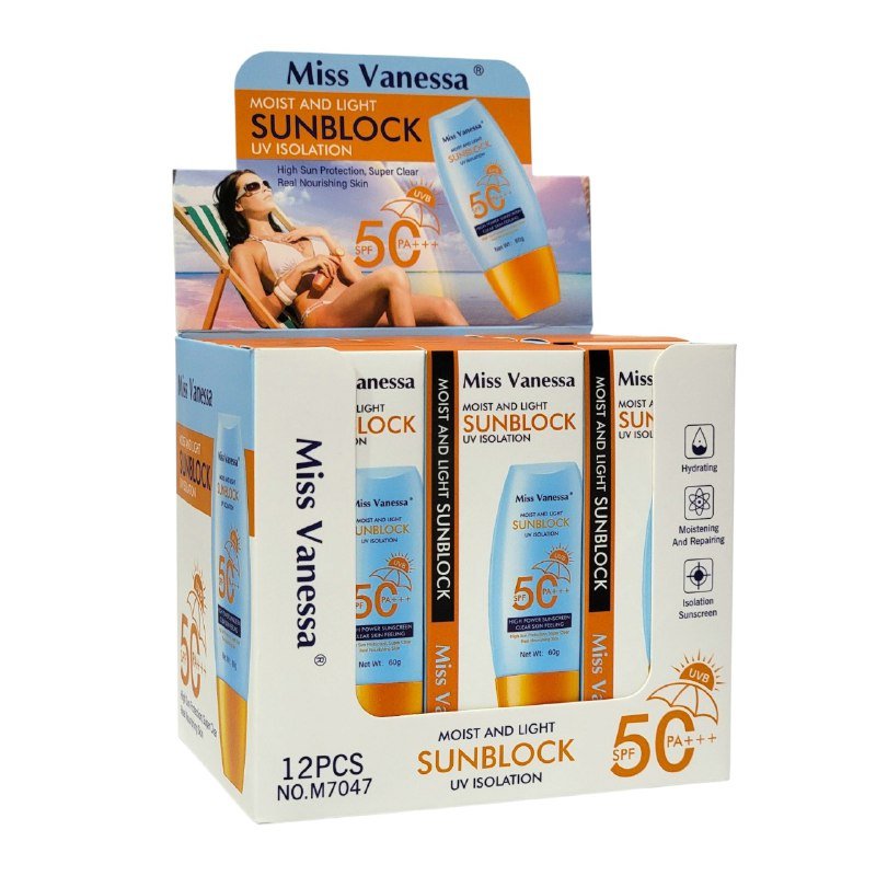 MISS VANESSA MOIST AND LIGHT SUNBLOCK UV ISOLATION, BLOQUEADOR SOLAR HÚMEDO Y LIGERO, AISLAMIENTO UV, ALTA PROTECCIÓN SOLAR, PIEL SÚPER CLARA Y REALMENTE NUTRITIVA, RICA EN COLAGENO, TEXTURA SUAVE Y FRESCA, PROTECCION DE BANDA COMPLETA SPF50 PA+++, PROTECCION DE LA PIEL CONTRA DAÑOS POR RADIACION UVB Y UVA, PREVENCION DE LA HUMEDAD DE LA PIEL Y LA PERDIDA DE NUTRIENTES, PREVENCION DE MANCHAS DE LA EDAD, CONT. 60G