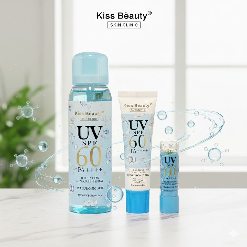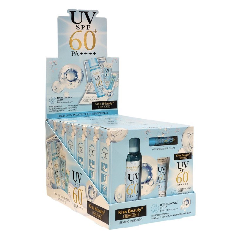 KISS BEAUTY UV SPF 60 PA+++ PROTECTOR SOLAR EN SPRAY DE 165ML, CREMADE MANOS 30ML Y BALSAMO LABIAL DE 3.5G, OFRECE UNA PROTECCIÓN INTEGRAL E HIDRATACIÓN FUERTE PARA TU CUERPO, MANOS Y LABIOS, CON UN EXTRA DE HIDRATACION Y EL BENEFICIO DE ACIDO HIALURONICO,
