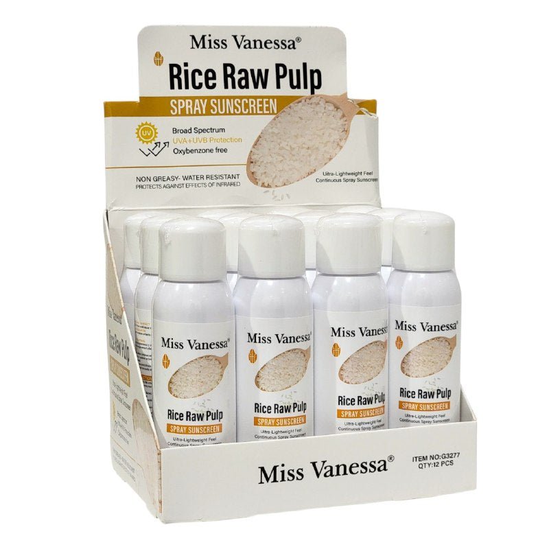 MISS VANESSA RICE RAW PULP SPRAY SUNSCREEN, PROTECTOR SOLAR EN AEROSOL DE PULPA DE ARROZ CRUDA, PROTECCIÓN UVA+UVB DE AMPLIO ESPECTRO, SIN OXIBENZONA, NO GRASA, RESISTENTE AL AGUA, PROTEGE CONTRA LOS EFECTOS DEL INFRARROJO, CONT. 150ML