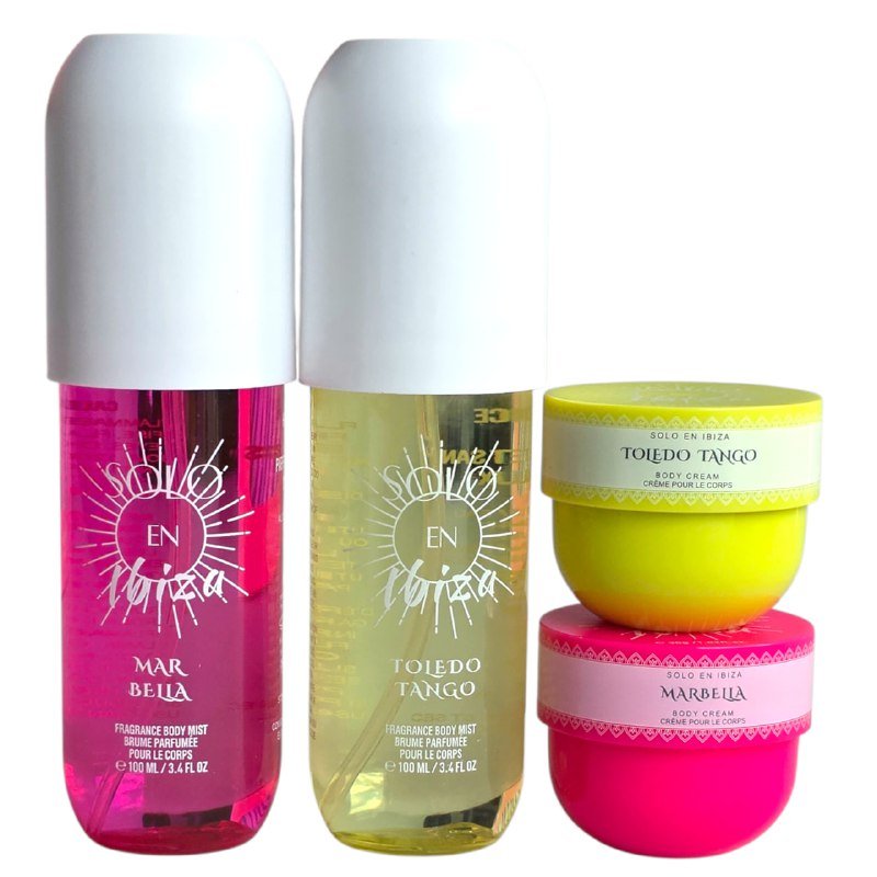 SET ORIGINAL SOLO EN IBIZA SUMMER ON DEMAND, INCLUYE 4 PIEZAS: FRAGRANCE BODY MIST TOLEDO TANGO CONT.100MLFRAGRANCE BODY MIST MAR BELLA CONT.100MLCREMA CORPORALE MAR BELLA CONT.30GCREMA CORPORALE TOLEDO TANGO CONT.30G