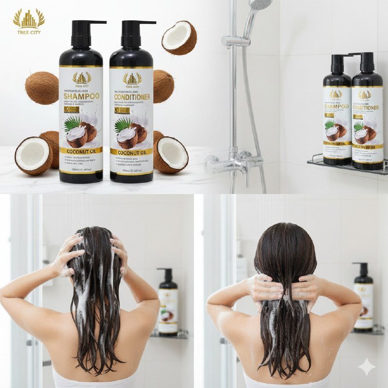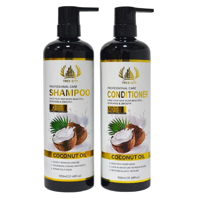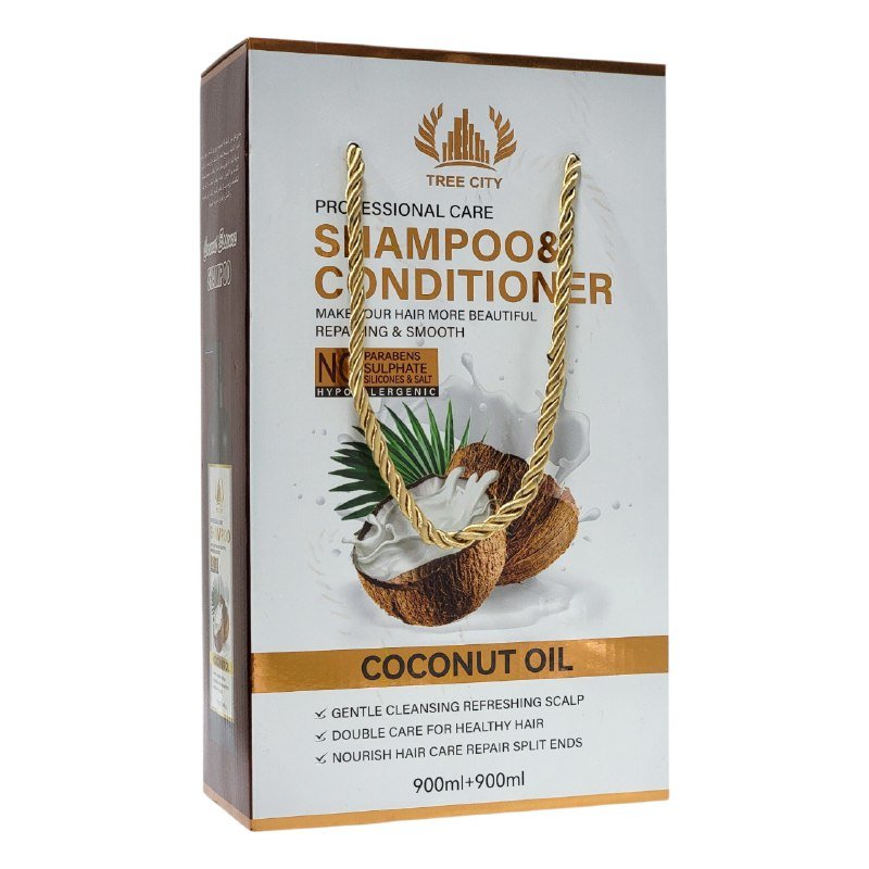 TREE CITY SHAMPOO & CONDITIONER COCONUT OIL, CHAMPÚ Y ACONDICIONADOR ACEITE DE COCO, DISEÑADOS PARA EL CUIDADO PROFESIONAL EN CASA, SU FORMULA ES HIPOALERGENICA Y LIBRE DE PARABENOS Y SULFATOS PROPORCIONANDO UNA LIMPIEZA SUAVE DEL CUERO CABELLUDO CON UN EFECTO REFRESCANTE, OFRECE UN DOBLE CUIDADO PARA UN CABELLO SALUDABLE, NUTRIENDO PROFUNDAMENTE LAS HEBRAS PARA REPARAR LAS PUNTAS ABIERTAS Y GARANTIZAR UN CABELLO LISO Y SEDOSO, CONT. 900ML+900ML