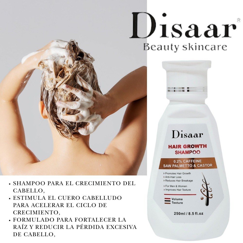 Descripción del producto: El Hair Growth Shampoo de Disaar es una solución integral diseñada para quienes buscan recuperar la densidad y salud de su melena. Este champú no solo limpia profundamente, sino que actúa como un tratamiento terapéutico que revitaliza el folículo piloso desde el interior. Su fórmula avanzada trabaja para equilibrar el cuero cabelludo, creando el entorno óptimo para un cabello más grueso, resistente y con un ciclo de vida prolongado.