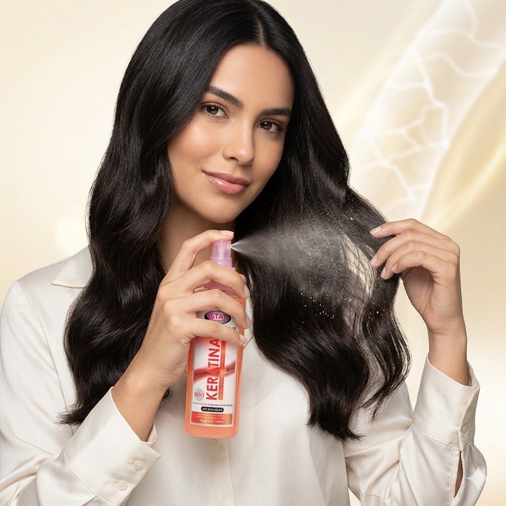 Enriquecido con Keratina: Proteína esencial que rellena las áreas dañadas del cabello, devolviendo la elasticidad y resistencia perdida.